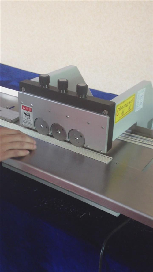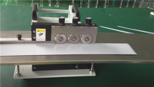 2、led自動分板機(jī)由三組圓刀片組成,上下兩片為一組,構(gòu)成一個切割單元。分別是A、B、C、三組。整個切割過程分為三個階段,A 組刀片先切割電路板40%,接著B刀片再次從A刀片切過的槽中碾過,再次完成40% 的切割量,最后由C組刀片切割最后的20% 并修光,由于每次的切割量很小,因此切割過程中產(chǎn)生的應(yīng)力較傳統(tǒng)的一次切斷方式減少了80% 以上,分割好的電路板邊緣平整光滑,板面非常平整,不扭不翹。是目前市面上唯一的走板式能保證切割后鋁板不變形的機(jī)器。